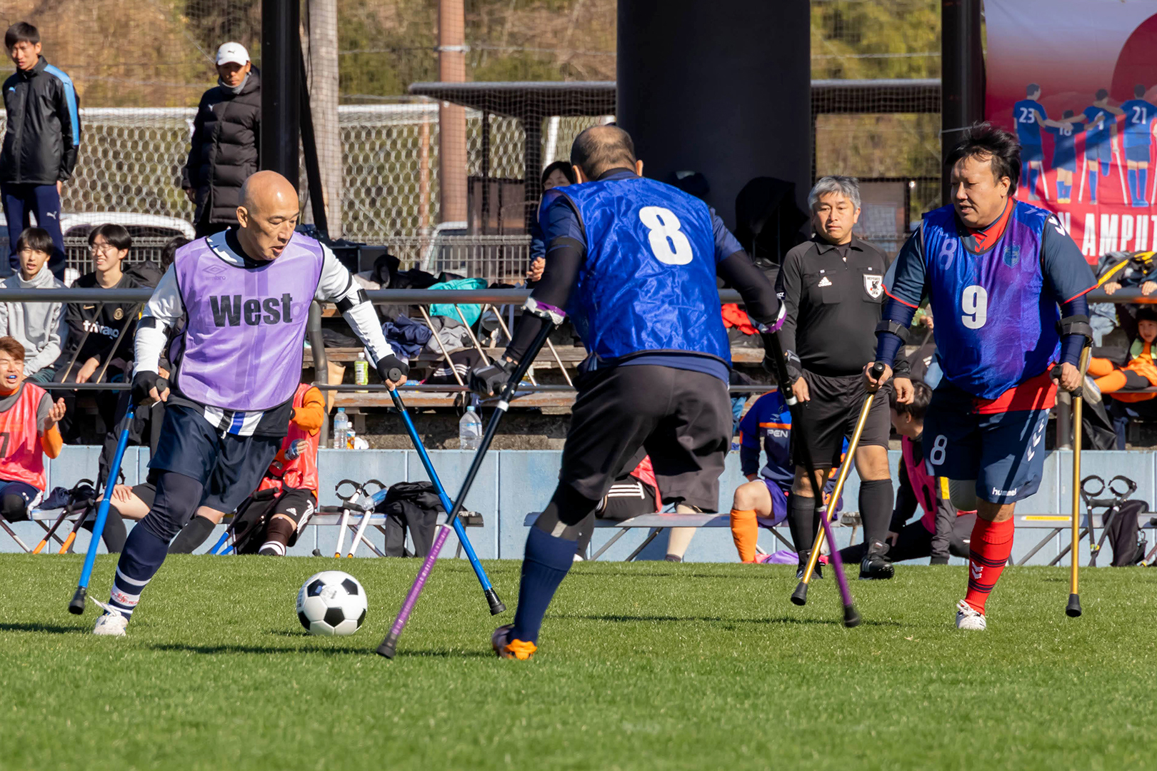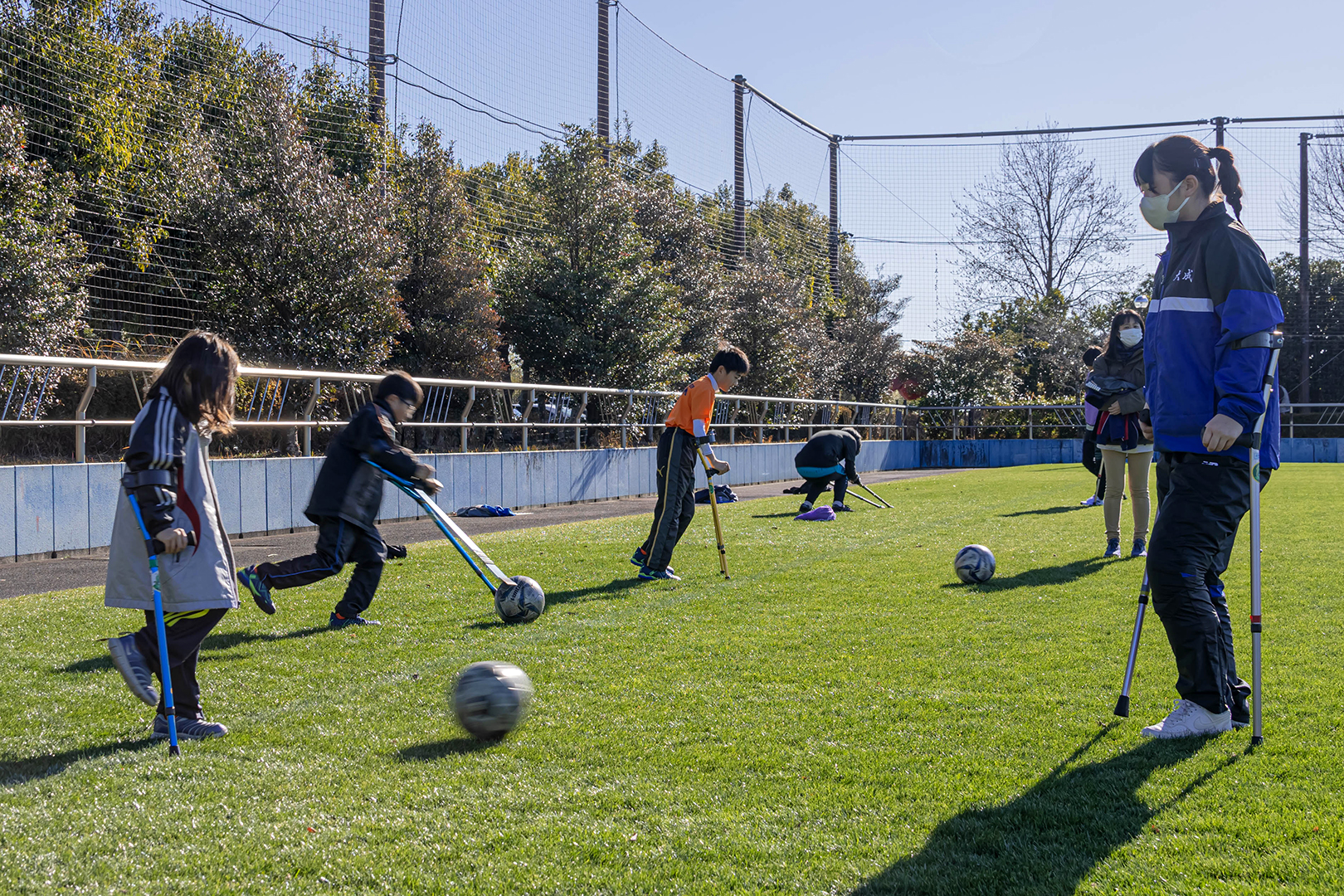 無料で借りられるクラッチを使って、走る・ドリブル・シュートなど、お子さんから大人までアンプティサッカーの楽しさ・難しさを体験できます。