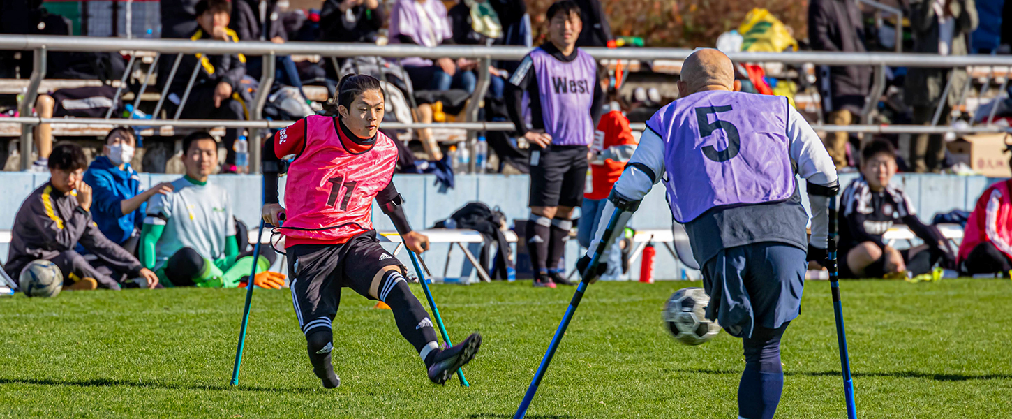 無料で借りられるクラッチを使って、走る・ドリブル・シュートなど、お子さんから大人までアンプティサッカーの楽しさ・難しさを体験できます。